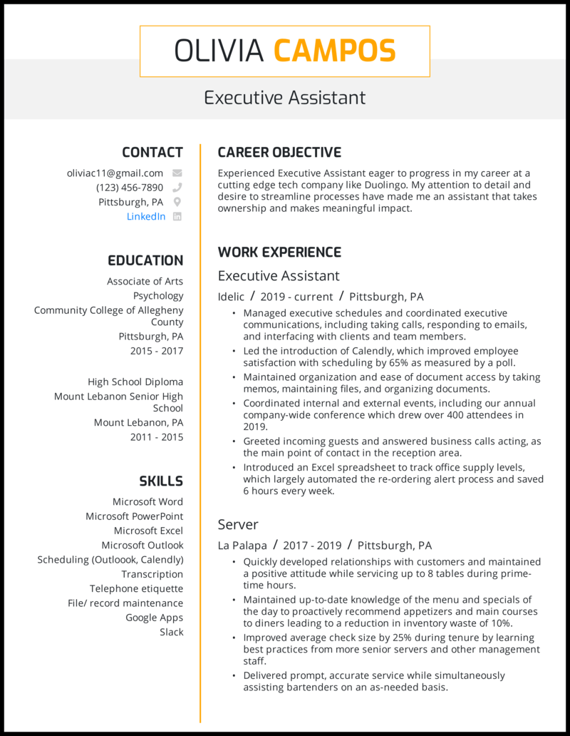 An executive assistant is responsible for performing complex you can find on this page various examples and tips on how to create an ideal executive assistant resume to help you stay ahead of the pack, use the.